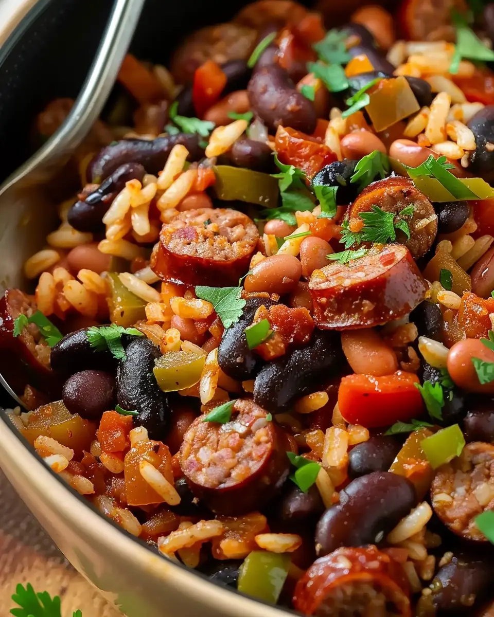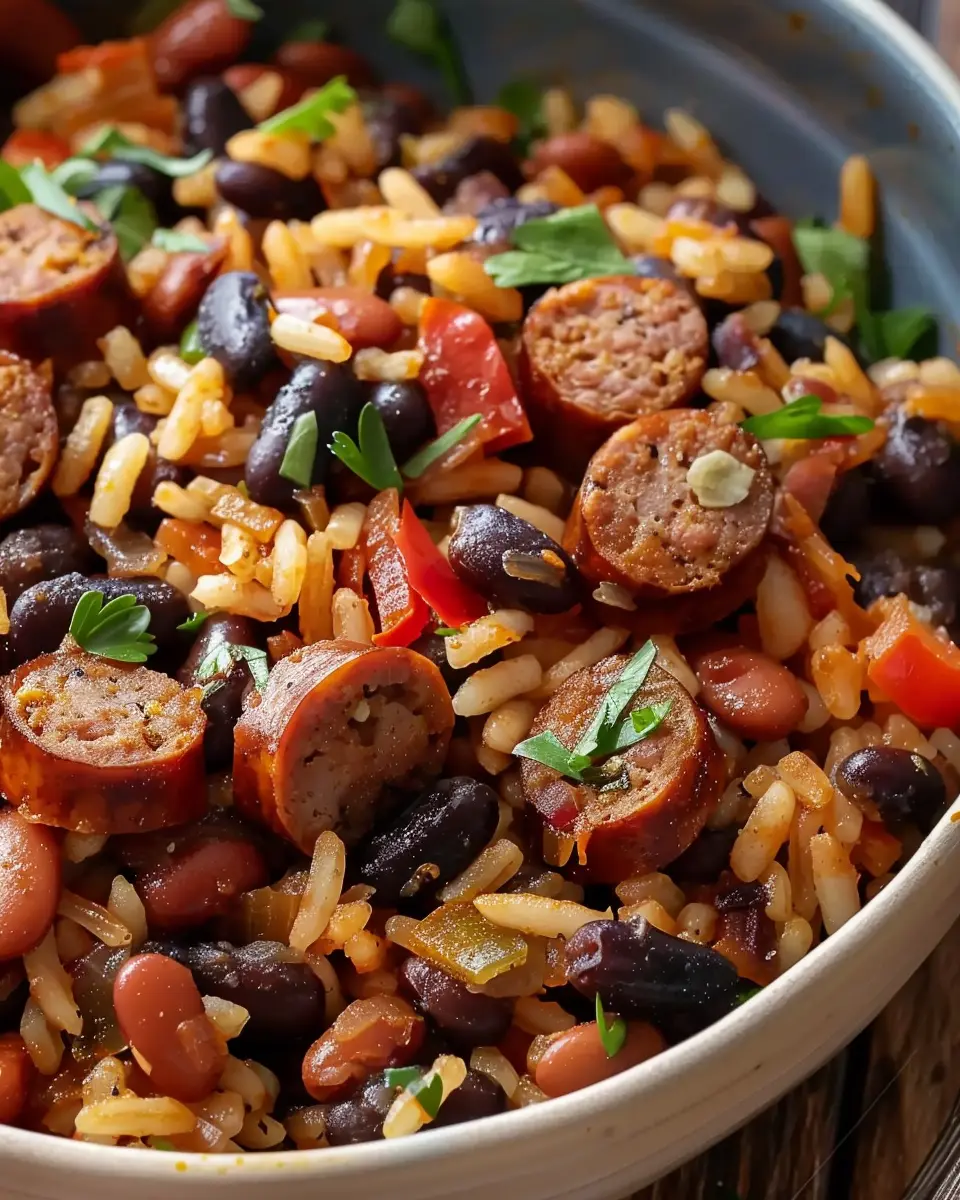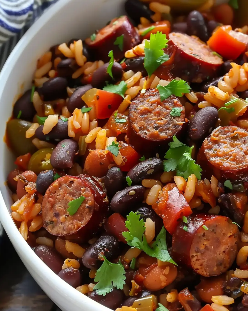 A delicious and hearty dish combining black beans, rice, and sausage, perfect for family meals.