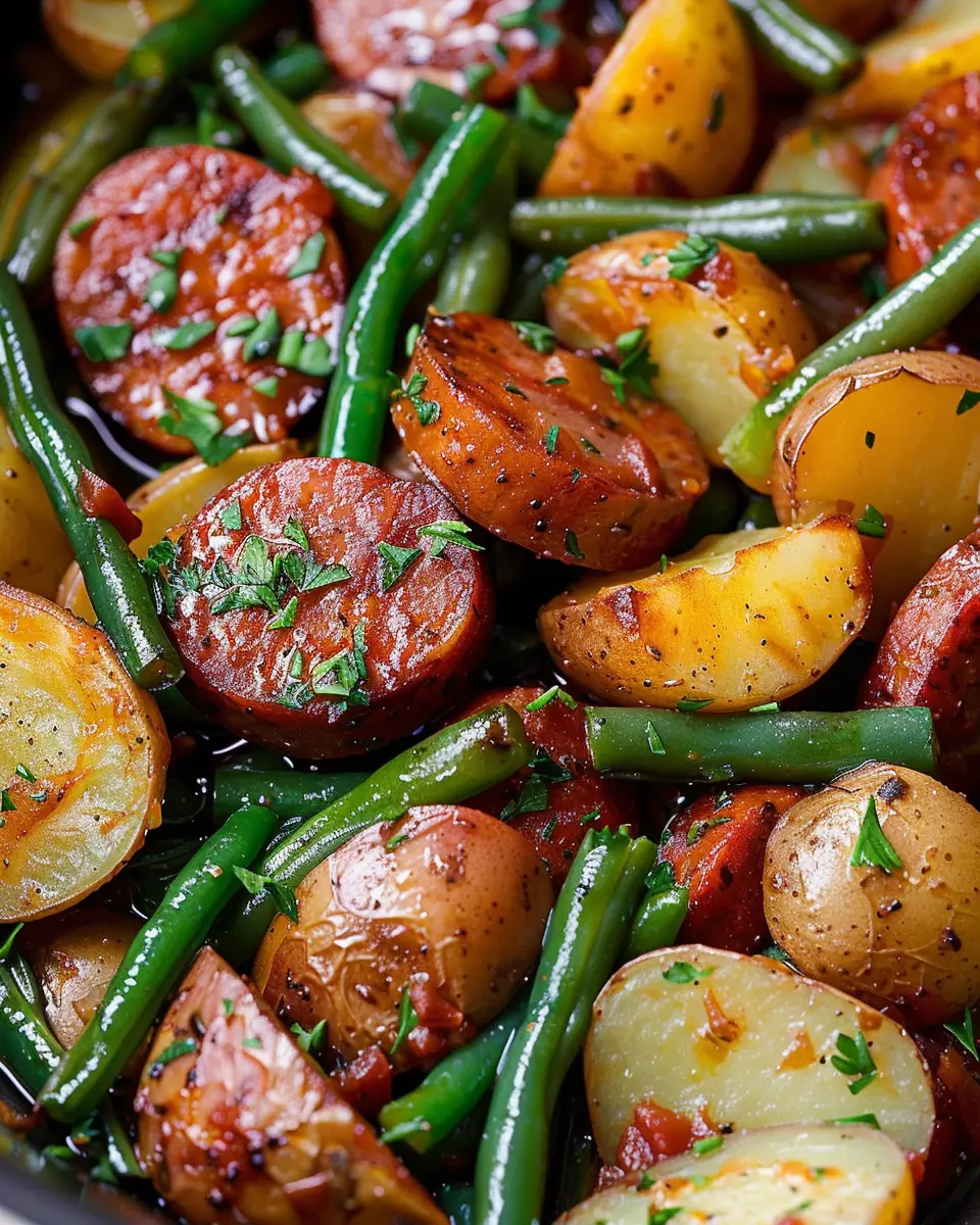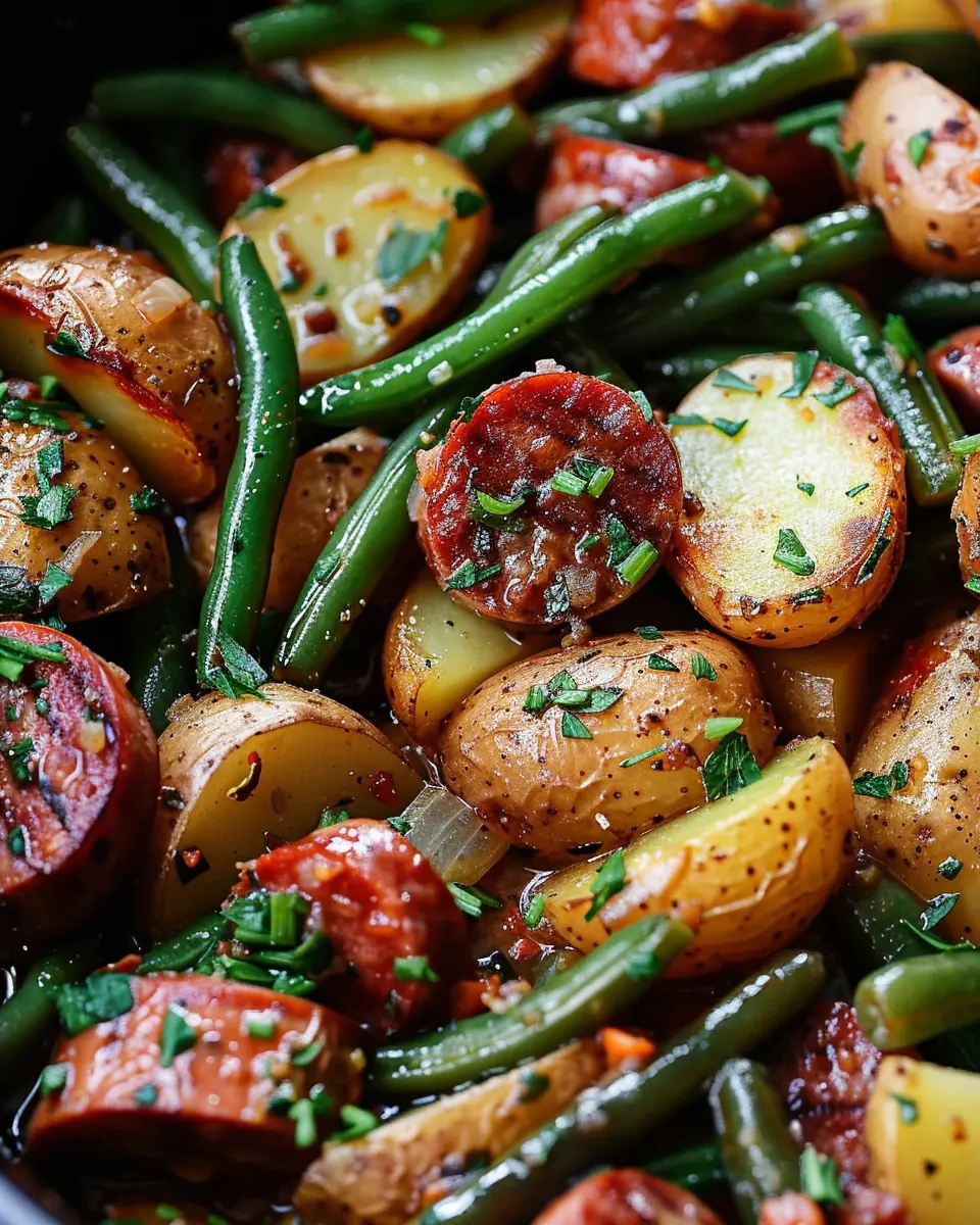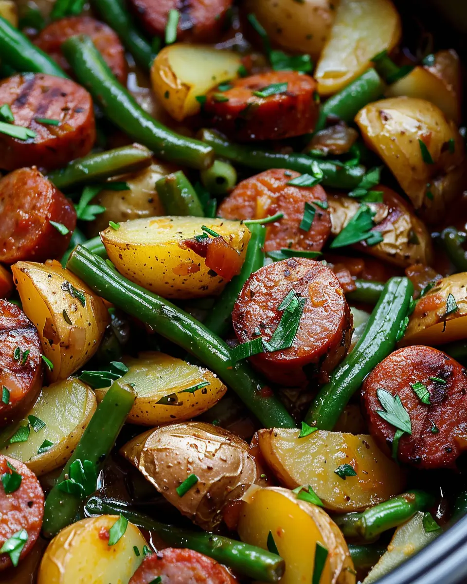 A comforting and flavorful crockpot dish featuring kielbasa, potatoes, and green beans.