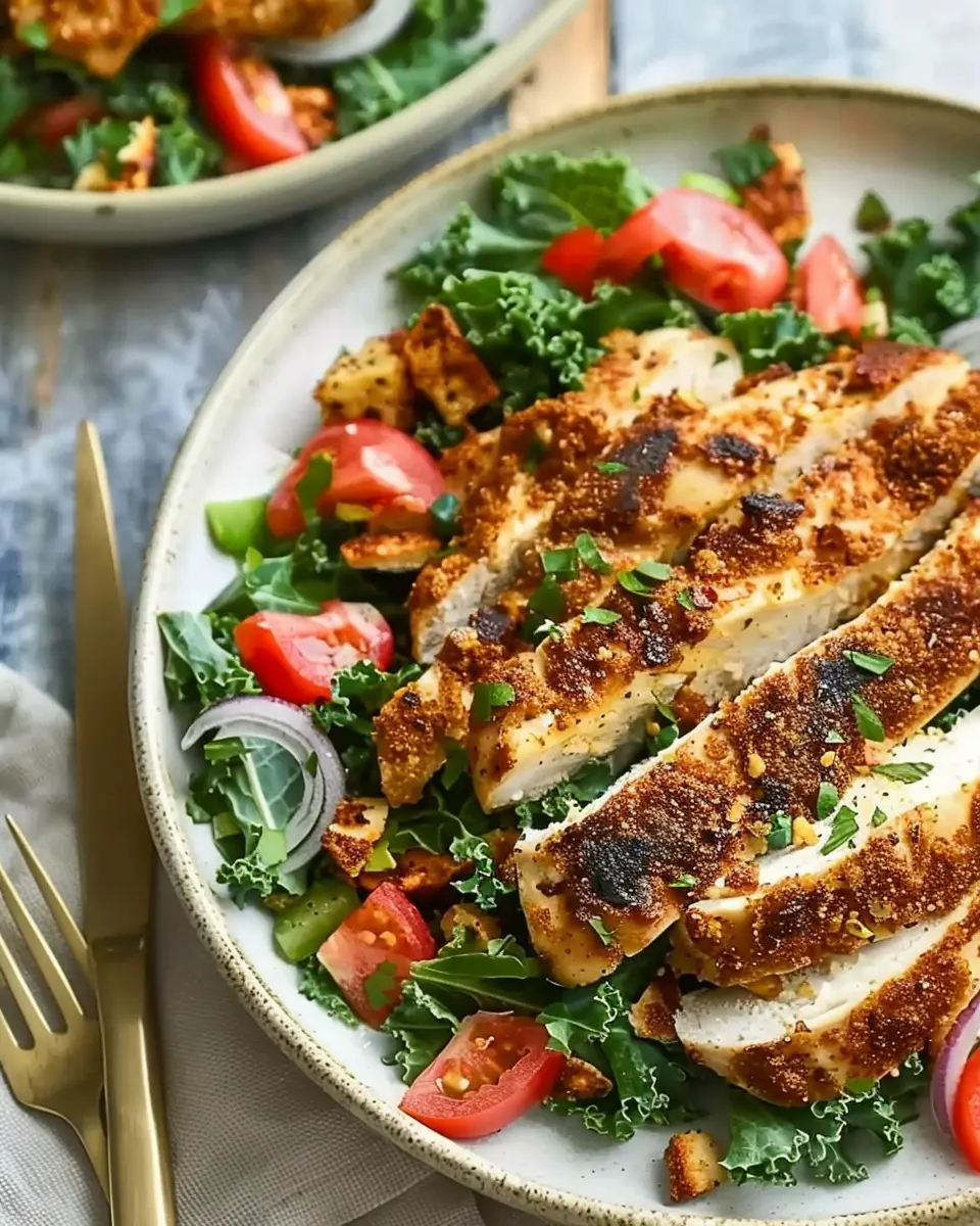 - Layer Heights: Start by placing your kale salad on one side of the plate, and then place the sliced chicken breast confidently on the opposite side, creating height.