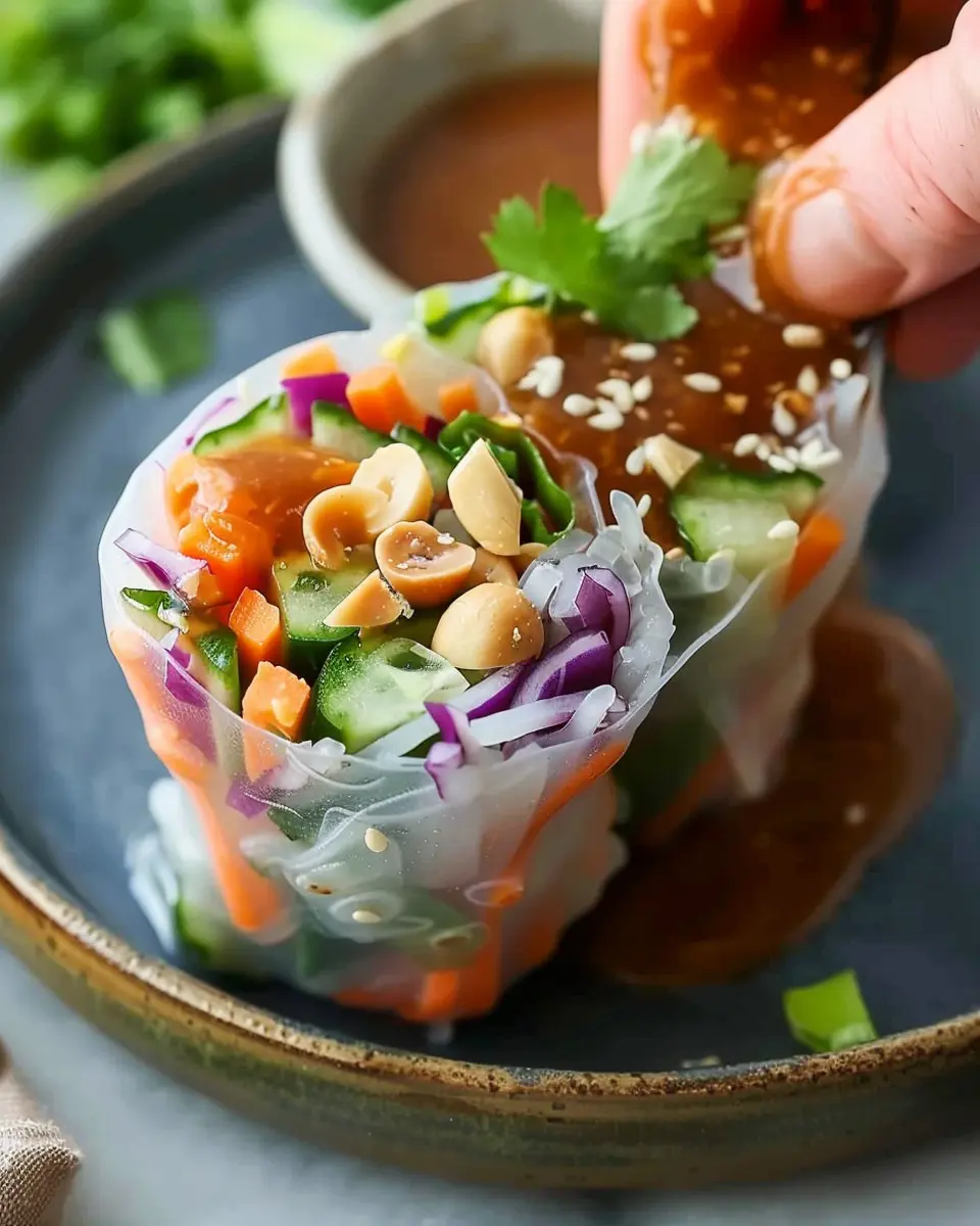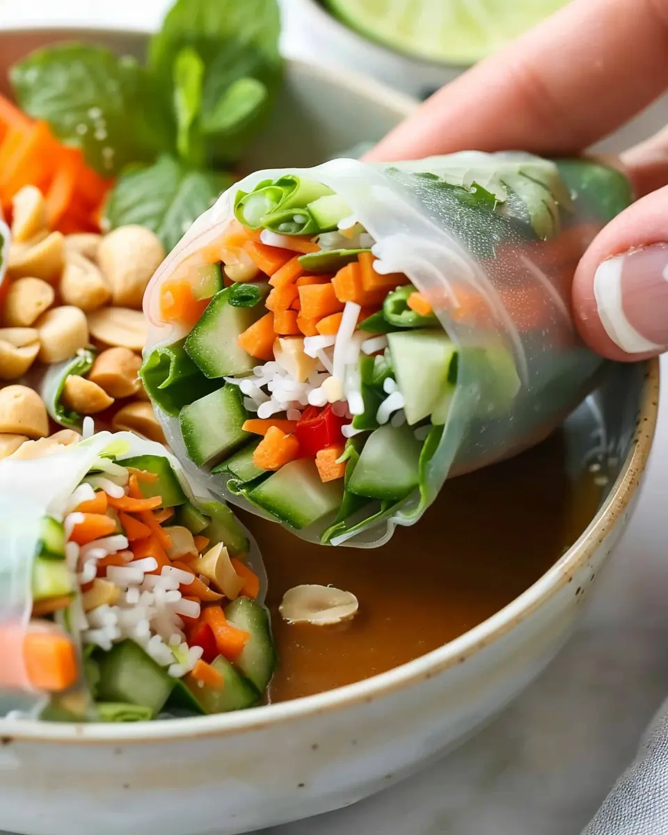 Once your rolls are finished, it’s time to enjoy them! Nothing pairs better with fresh spring rolls than a savory peanut sauce. Simply whisk together peanut butter, soy sauce, a splash of lime juice, and a touch of honey or maple syrup for sweetness.