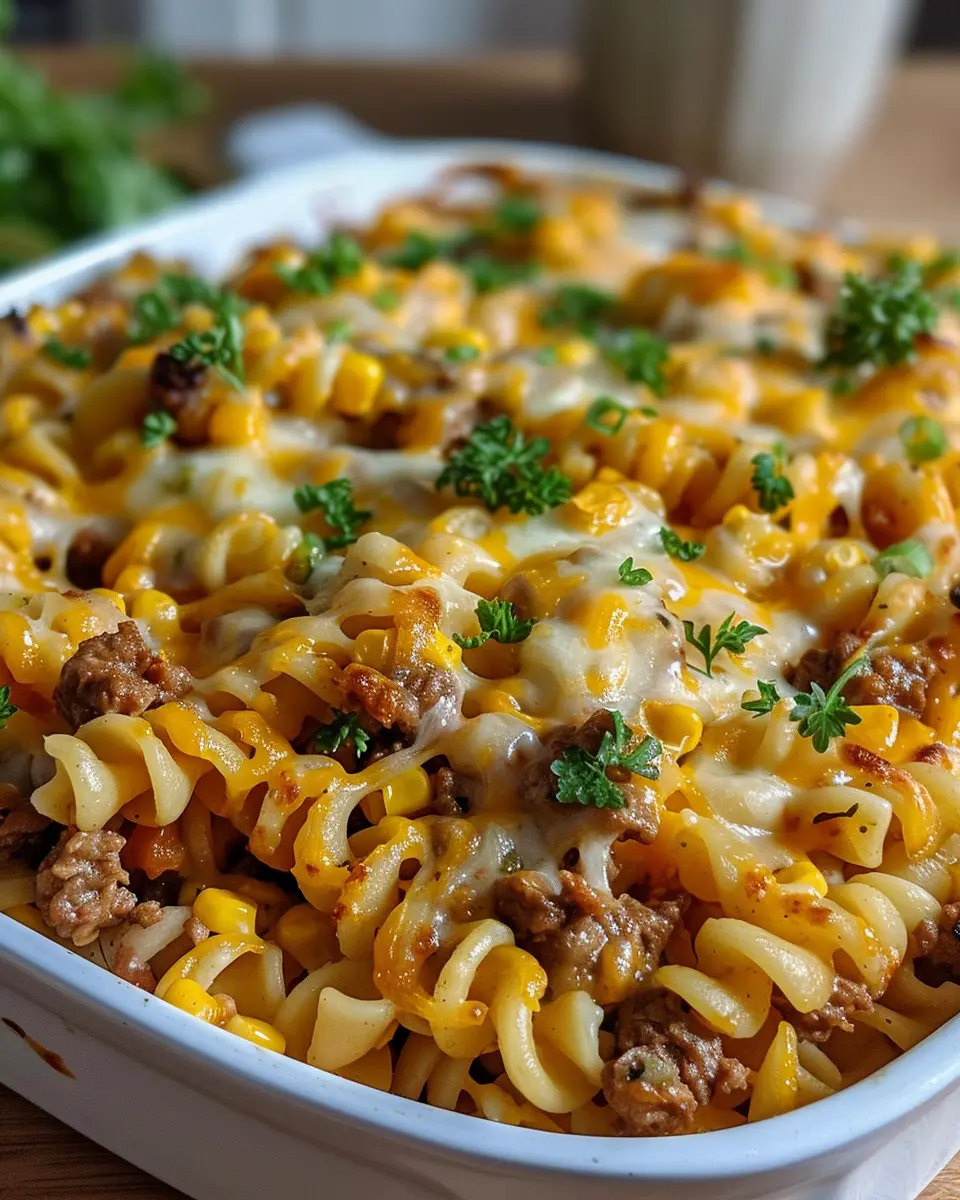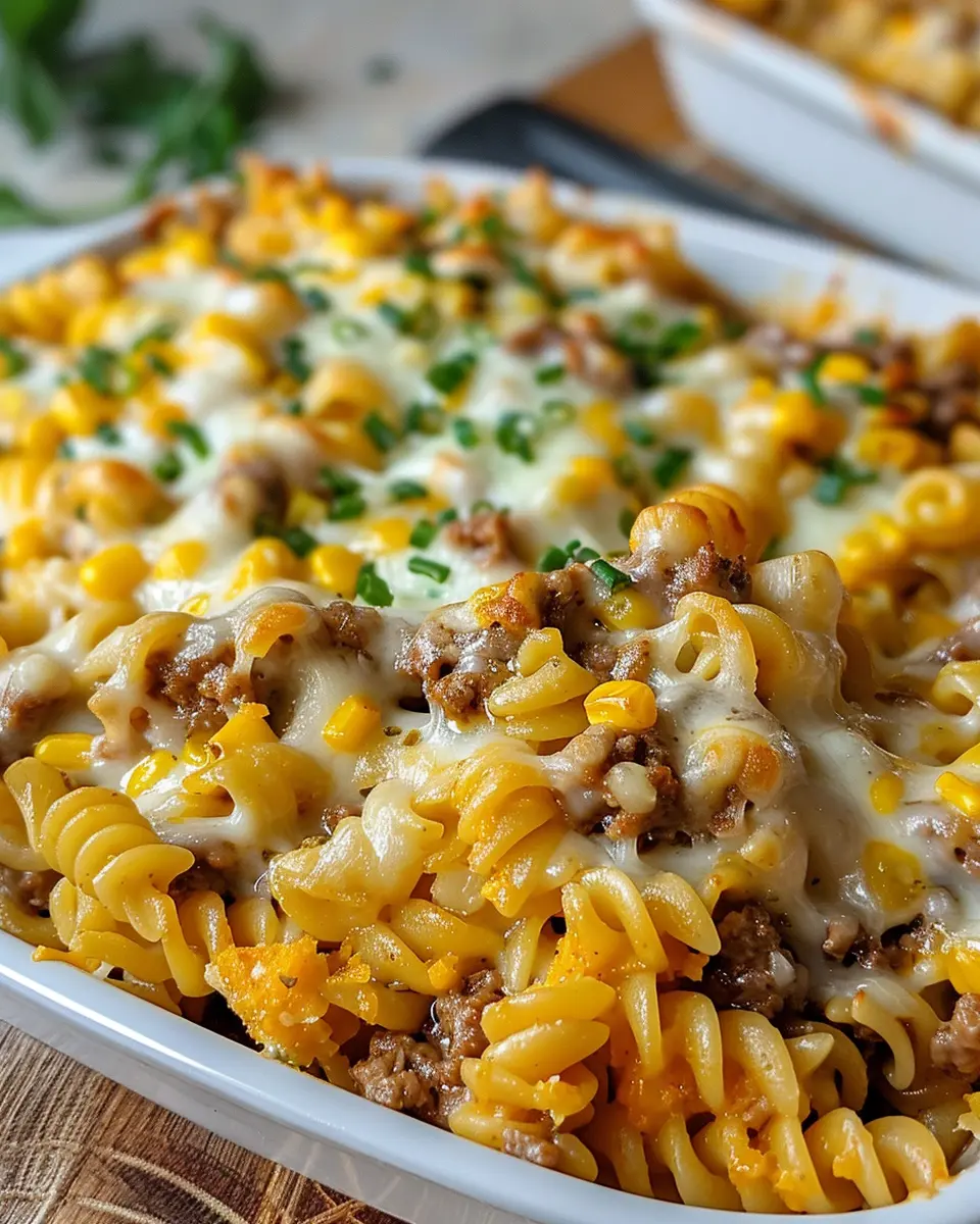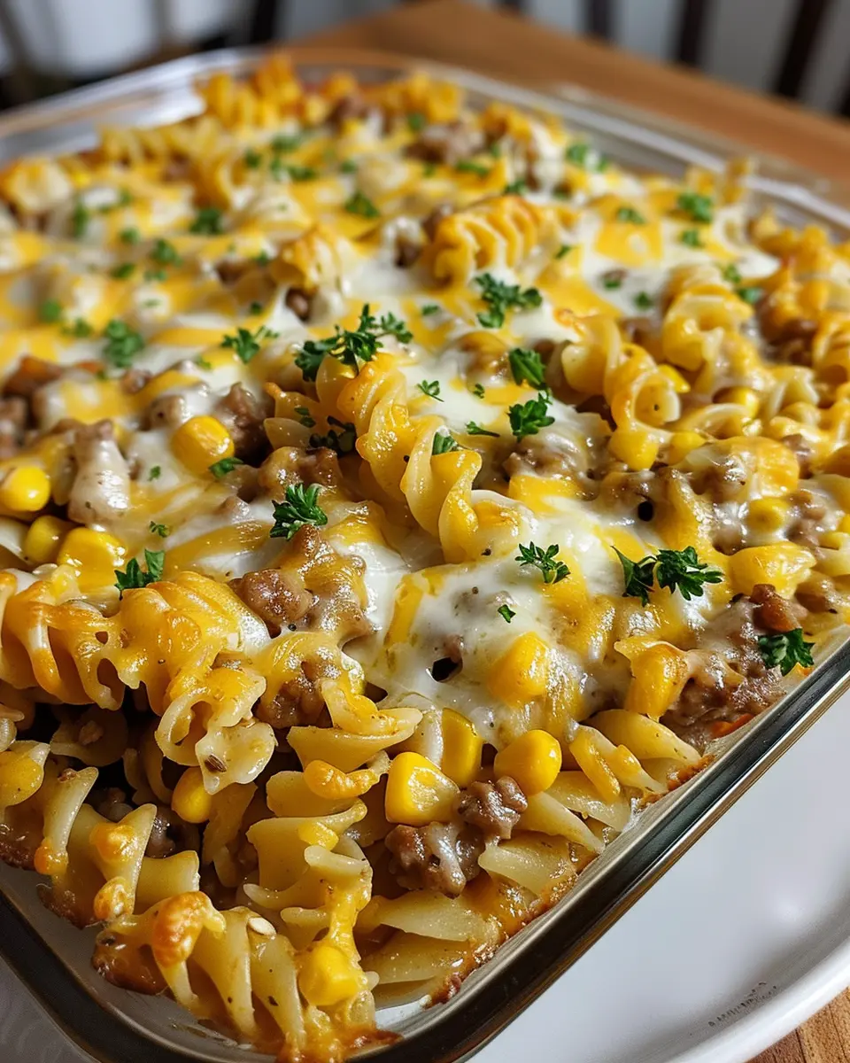 Experience the ultimate comfort food with this loaded cheddar ranch beef and sweet corn rotini bake, combining savory beef, creamy cheese, and sweet corn in a deliciously easy dish.