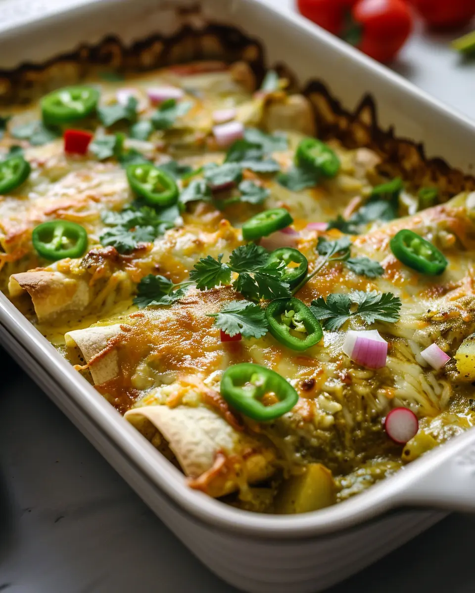 Elevate your plant-based potato green chili enchiladas with a few simple yet delicious garnishes. Consider adding a sprinkle of fresh cilantro or a dollop of avocado crema for a creamy finish. A squeeze of lime juice adds brightness, enhancing the flavors beautifully. Crumbled vegan cheese or sliced jalapeños can provide an extra kick if you’re feeling adventurous. And don’t forget to serve some pickled red onions on the side—they add a zesty crunch that perfectly balances the dish.