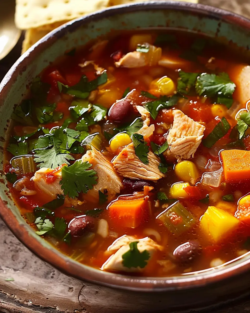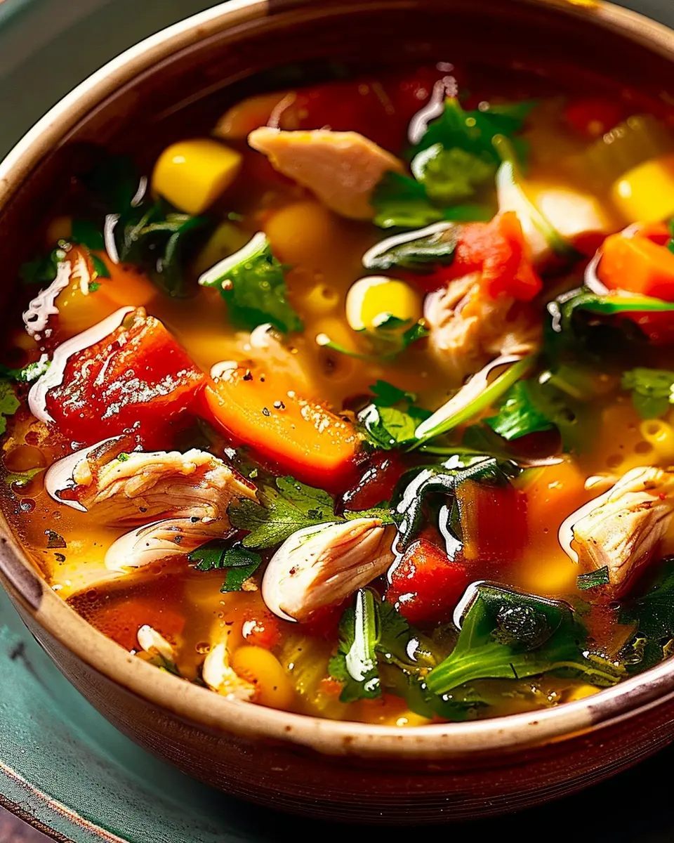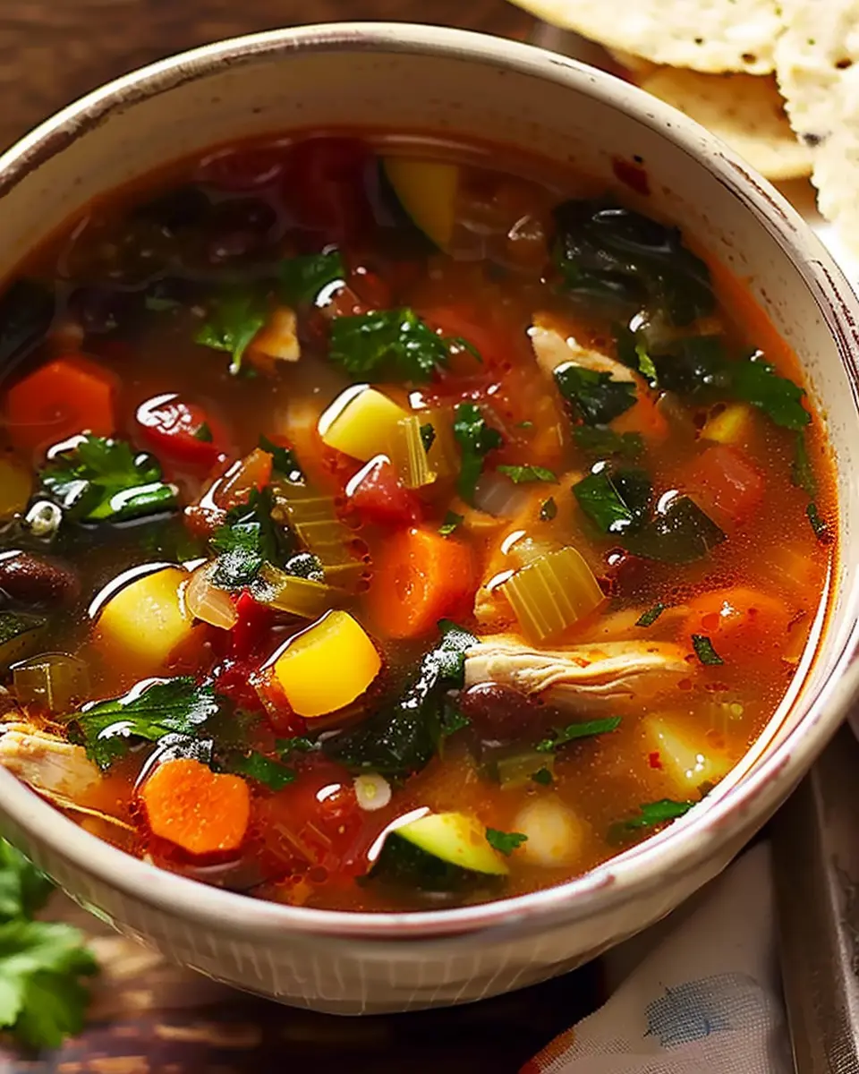 Warm up with this delicious and spicy vegetable and chicken soup that brings comfort and zest in every bite.